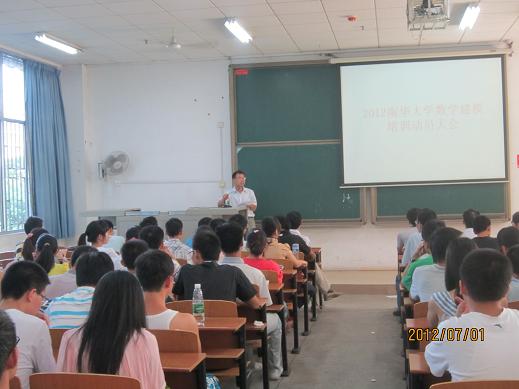 2012年7月1日上午,公司2012年全国老员工数学建模竞赛暑假培训动员会在1教114教室隆重举行。为期34天的培训工作就此拉开了序幕。bevictor伟德官网经理欧阳自根教授、公司党委书记彭建军教授、副经理胡和平副教授,教务处副处长廖基定教授、数学教研室主任廖新元教授和教师代表以及去年参赛和今年校选拔赛获奖的同学(40个队)参加了此次动员会。