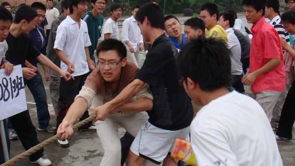 随着哨声的响起,比赛双方开始激烈的争夺。双方队员弓腿侧身,铆足了劲。啦啦队的加油声也排山倒海般响彻整个球场。场上的队员,双手紧握绳索,随着啦啦队的加油声而全力以赴,只见绳中央的红线结在中部区域来回徘徊,双方都顽强的坚持着,最后,经过激烈角逐,051班取得冠军,亚军和季军分别被061班和062班夺走。