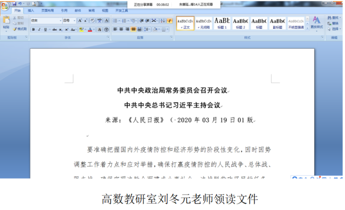 工程数学教研室党支部:大家一起学习了习近平总书记的系列重要讲话和部分老师领读完后,老师们就如何搞好疫情防控和网络教学工作开展热烈的讨论,大家纷纷表示拥护习近平总书记对关于疫情防控的重要讲话,也非常赞成他的经济社会发展部署,要以更加饱满的热情投入到网络教学中去。老师们认为湖北和武汉医疗救治、社区防控和后续工作任务依然艰巨繁重,其他地区人员流动和聚集增加带来疫情反弹风险依然存在,特别是国际疫情快速蔓延带来的输入性风险增加。要毫不放松抓紧抓实抓细各项防控工作,决不能让来之不易的疫情防控持续向好形势发生逆转。会后,大家分享了一个多月以来上网课的经验,并对遇到的问题进行讨论,给出了解决办法。