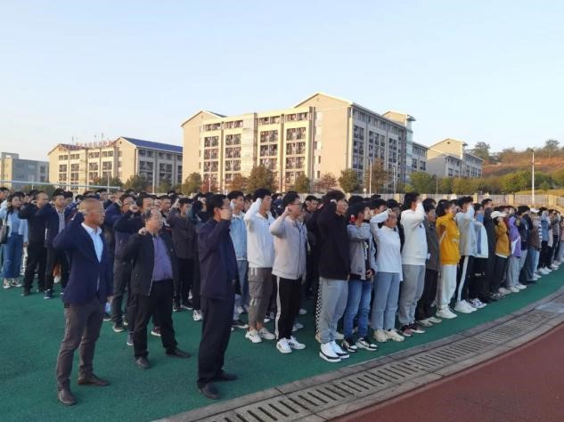 然后,员工会主席郑宇茹带领全体同学面向国旗宣誓。迎着朝阳的田径场上,被坚定有力的宣言充斥着,当代青年的爱国赤子之心在庄严的红旗下熠熠生辉。