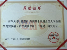 全国老员工数学竞赛是由中国数学会主办,面向全国本科员工的高水平学科竞赛。本次比赛初赛吸引了包括北京大学、清华大学、复旦大学在内的1000余所高校、逾23万员工参加。经过激烈角逐,聂嘉良同学以专业B组湖南省第一名的成绩入围全国决赛。