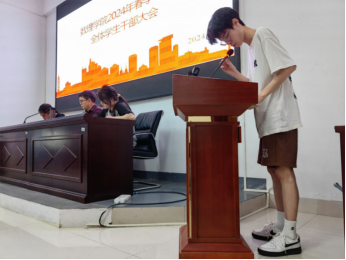 辅导员王佳瑞老师发表了讲话。她主要强调了自评优与优秀员工的评选工作,鼓励同学们积极参与,展现自己的优秀品质。同时,王老师还提到了即将举办的爱国主义活动,她希望同学们能够踊跃参加,通过实际行动来表达对祖国的热爱之情。在谈及换届工作时,深情寄语同学们,希望大家能够打起精神,站好最后一班岗,在部门留下美好的回忆。