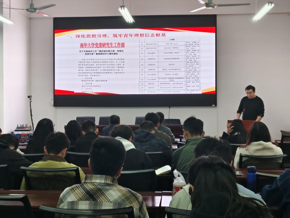 随后,2024年研究生团总支副书记刘昱辰代表研团总支作年度工作总结。他全面回顾了2024—2025学年在思想引领、组织建设和校园文化等方面的工作成果,剖析当前不足,并对下一届团总支工作提出建议。