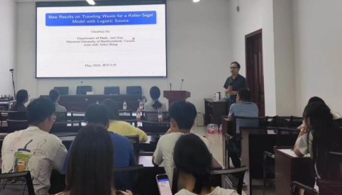 第三场讲座以《New Results on Traveling Waves for a Keller-Segel Model with Logistic Source》为题,同样由欧春华教授主讲。欧教授通过对Keller-Segel化学趋化系统的行波现象进行研究,提出了新的结果,为我们理解系统的传播行为和估计传播速度提供了重要启发。欧教授在演讲中与观众保持密切互动,不仅聆听他们的疑问和反馈,还以生动的讲解和实例分享激发了听众的思考与探索欲望。这种交流与互动不仅使演讲更加生动有趣,也让听众更加投入其中,共同探索学术话题。